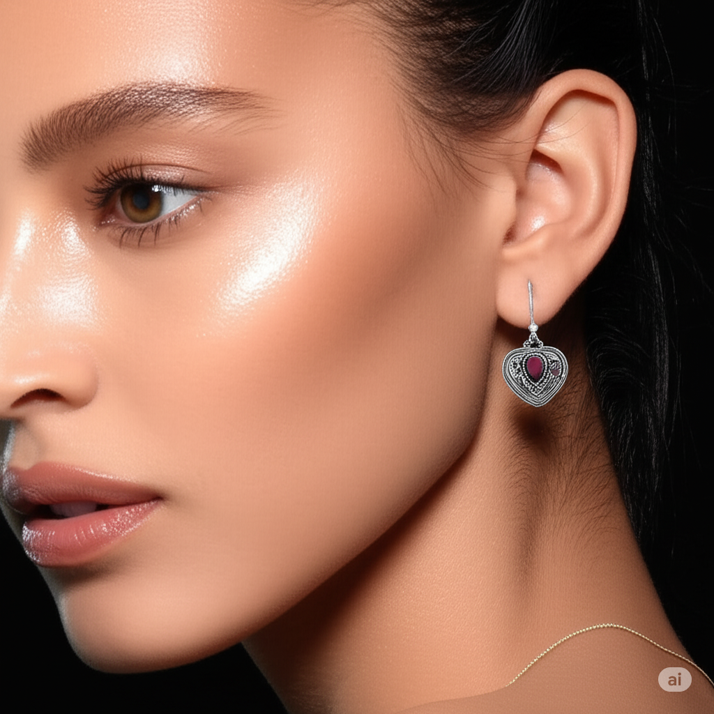These enchanting 925 sterling silver earrings are a testament to classic romance and artisanal craftsmanship. Each earring is a beautifully detailed heart-shaped dangle, suspended from a comfortable lever-back closure. At the center of the heart lies a luminous, teardrop-shaped garnet stone, which captures the eye with its deep, passionate red hue.