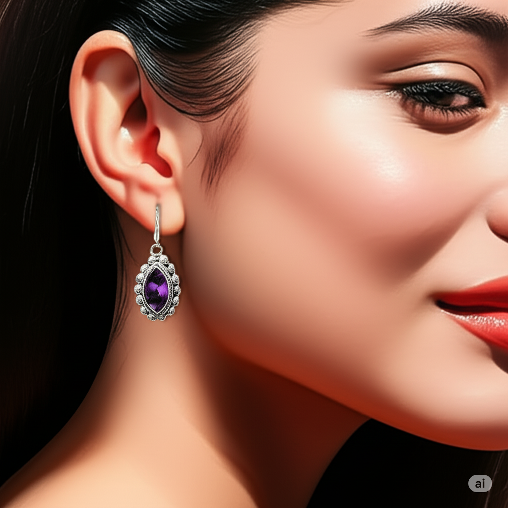 These exquisite silver drop earrings feature a captivating marquise-cut amethyst gemstone, set within an elegantly detailed silver frame. The vibrant purple of the amethyst is beautifully complemented by the intricate silverwork, which includes a delicate twisted rope border and a scalloped outer edge, adding a touch of vintage charm and sophistication. Designed with secure lever-back clasps, these earrings offer both comfort and peace of mind, making them perfect for those who appreciate both style and practicality. Ideal for adding a pop of color and luxury to any ensemble, they are a versatile accessory for both everyday wear and special occasions.